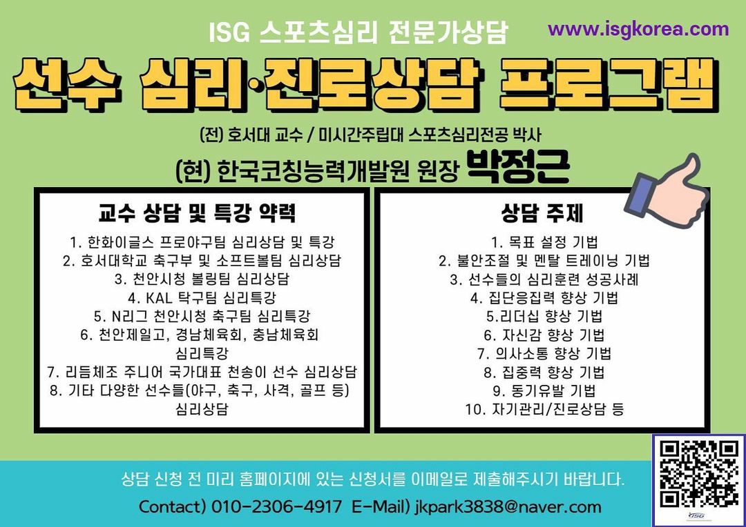 ISG에서 스포츠 선수 심리/진로상담 프로그램 참가자를 모집 중입니다.