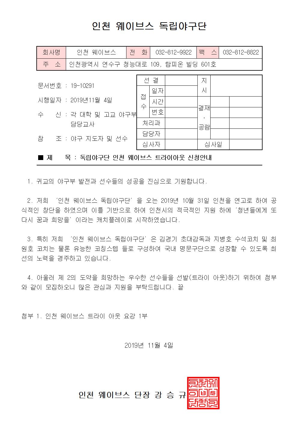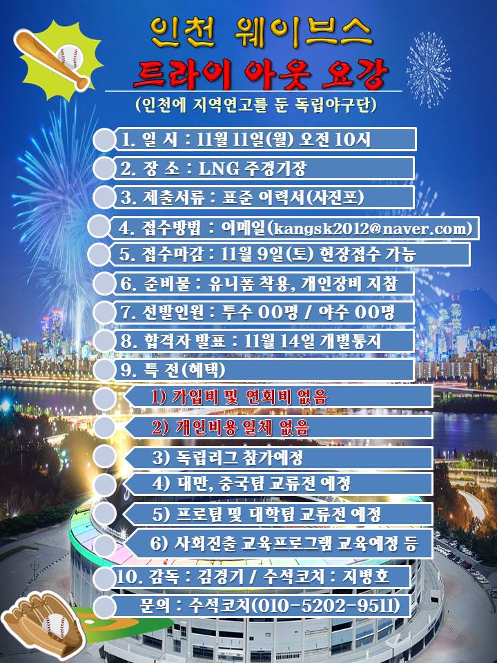 인천 웨이브스 독립야구단에서 오는 11월 11일(월) 오전 10시에 별첨과 같이 트라이아웃(입단테스트)을 실시합니다. * 기사자료... http://www.incheontoday.com/news/articleView.html?idxno=117767
