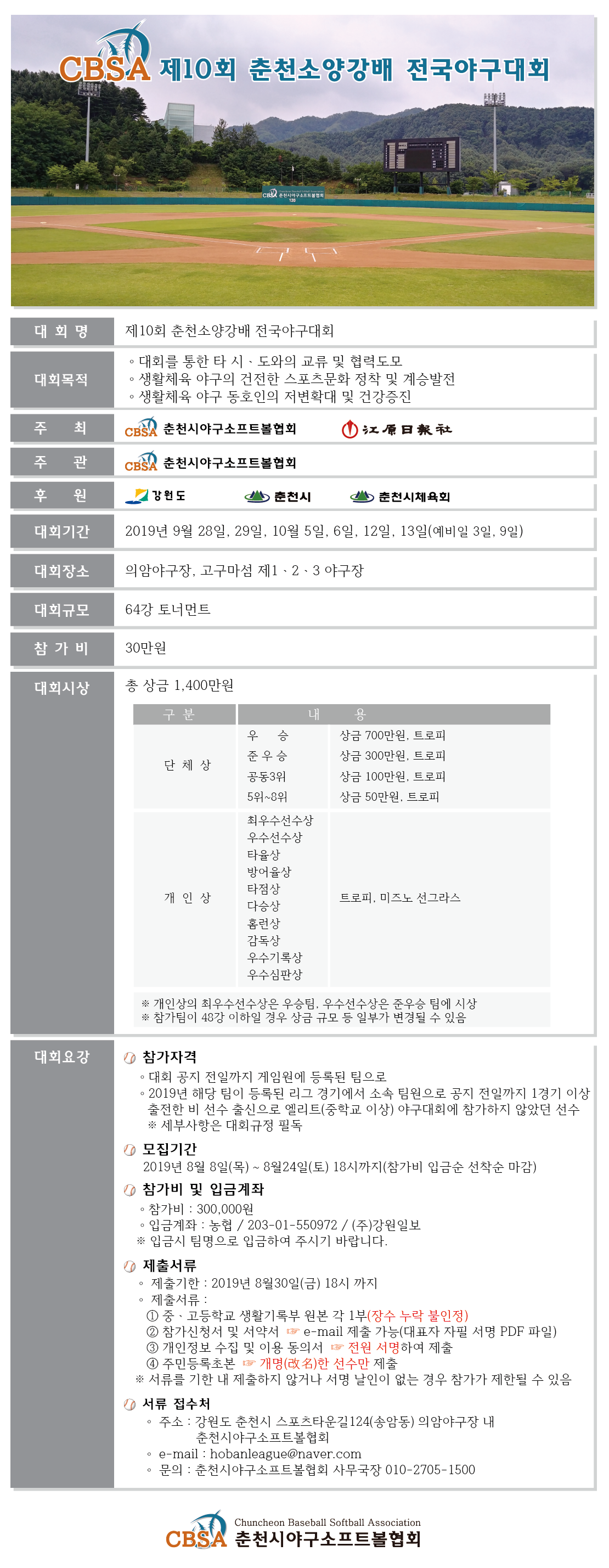 [4부 우승 700만원] 제10회 춘천소양강배 전국야구대회(5위~8위 각 50만원)