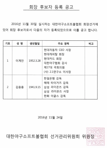 대한야구소프트볼협회 회장 후보자 등록 공고