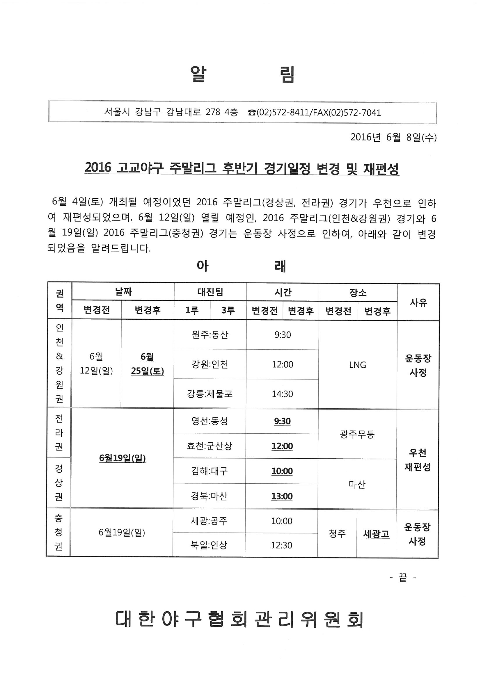 2016 고교 주말리그 후반기 경기 일정이 우천순연과 경기장 순연으로 인하여 변경되었습니다.