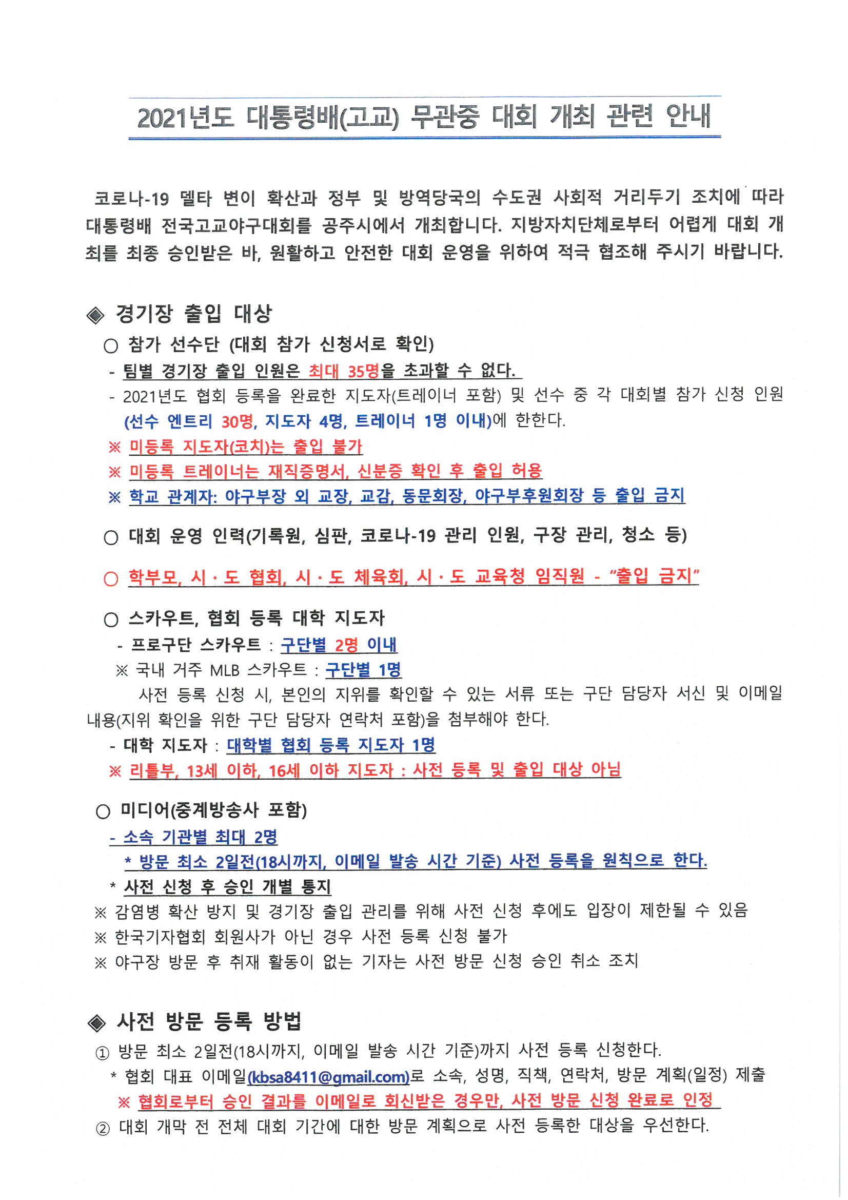 - 선수단, 대회 운영을 위한 최소 인원 외 학부모, 시‧도 협회, 시‧도 체육회, 시‧도 교육청 임직원 “전면 출입 금지 조치”