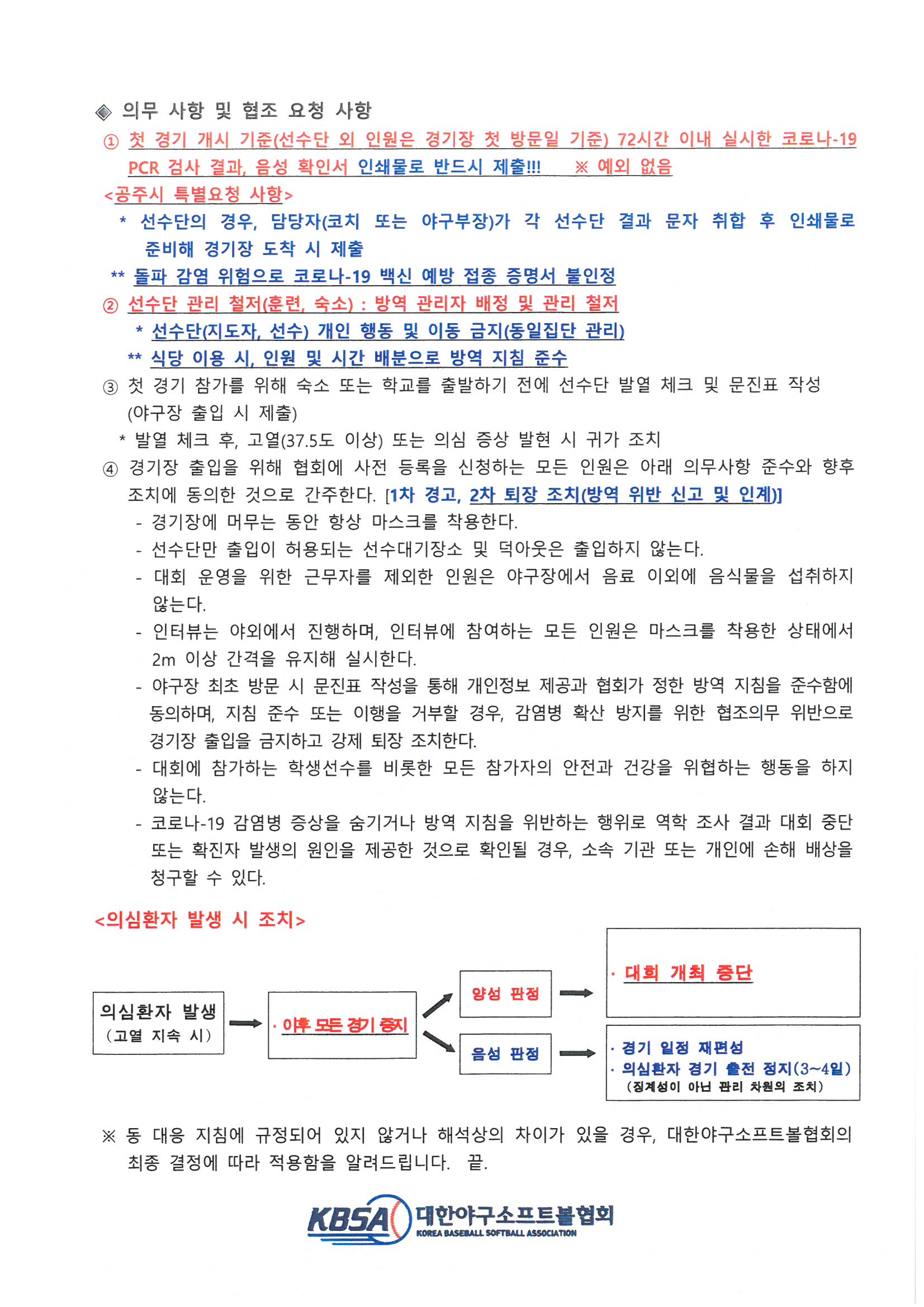 - 첫 경기 개시 기준(선수단 외 인원은 경기장 첫 방문일 기준) 72시간 이내 실시한 코로나-19 PCR 검사 결과 또는 음성 확인서 인쇄물로 제출(매일 취합 후 공주시청에 제출)