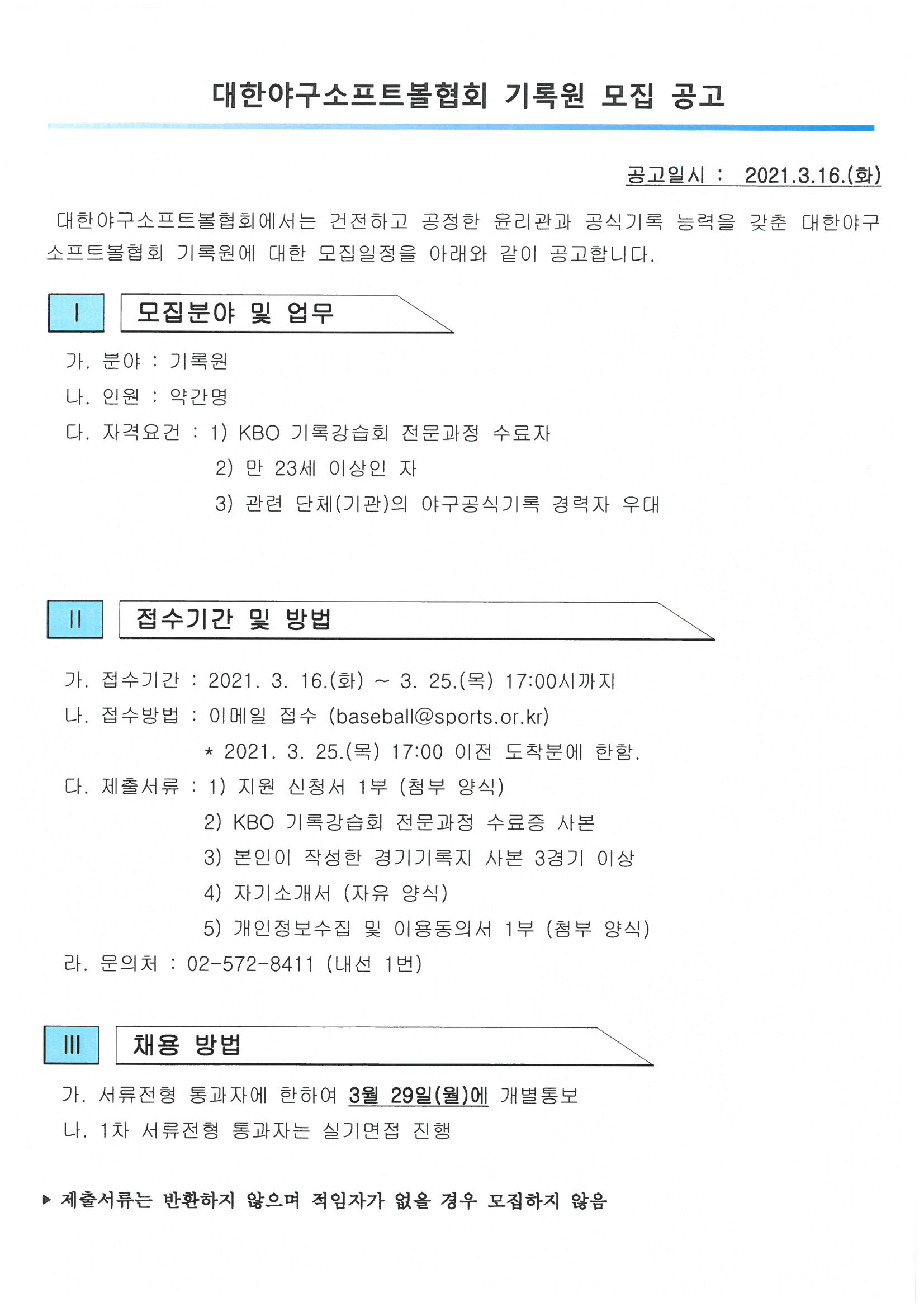 대한야구소프트볼협회 기록원 모집 공고