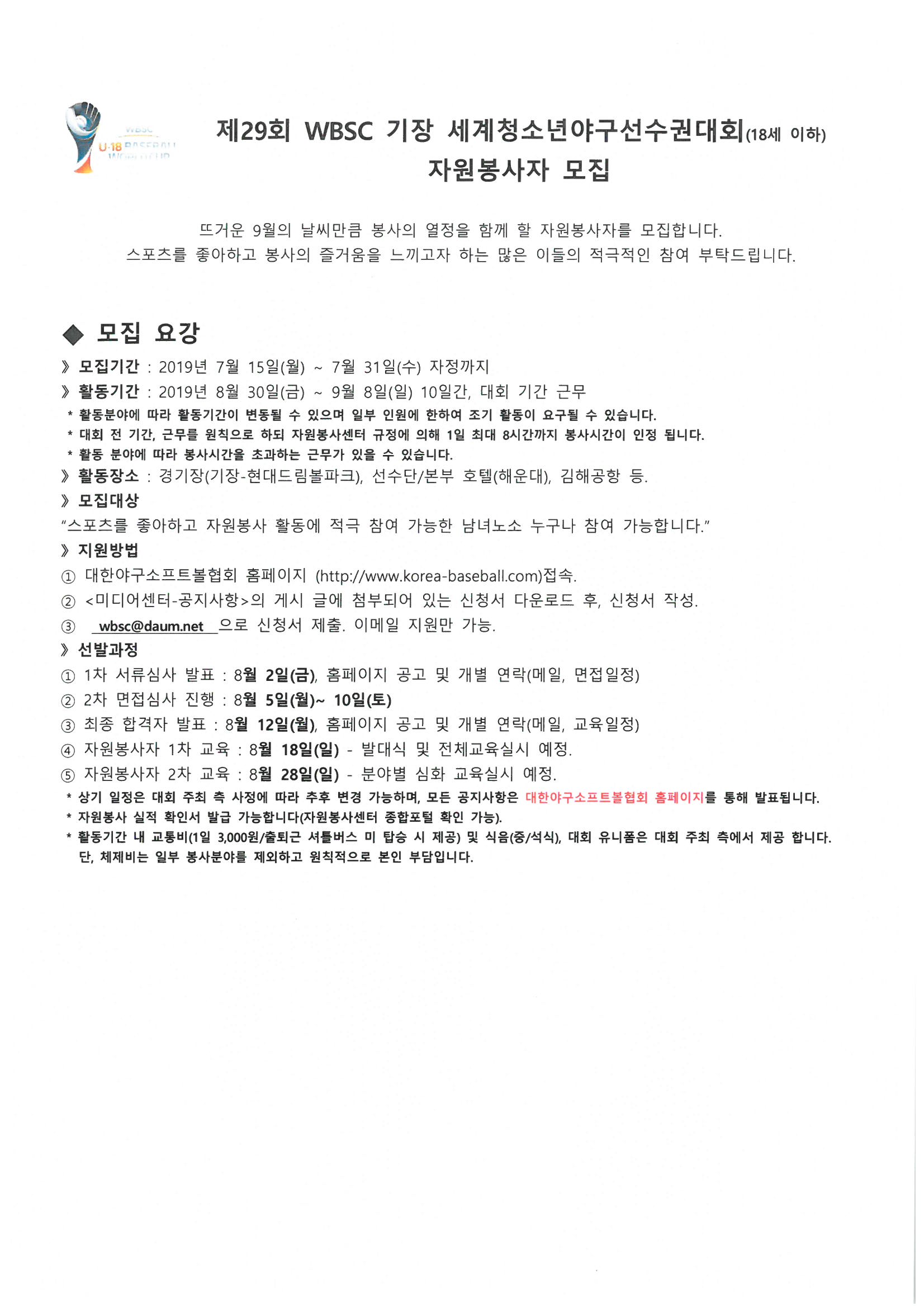 제29회 WBSC 기장 세계청소년야구선수권대회 자원봉사자 모집