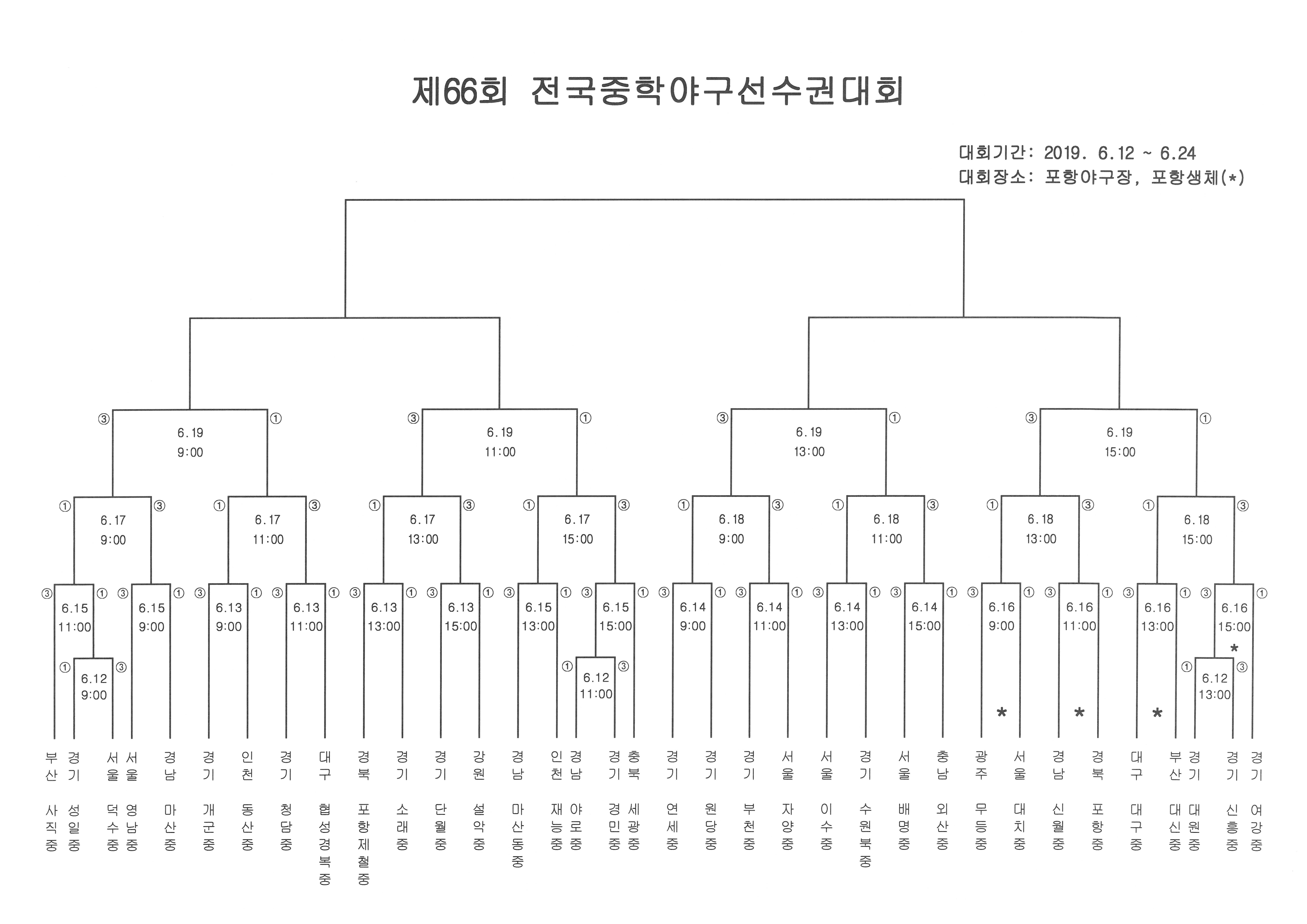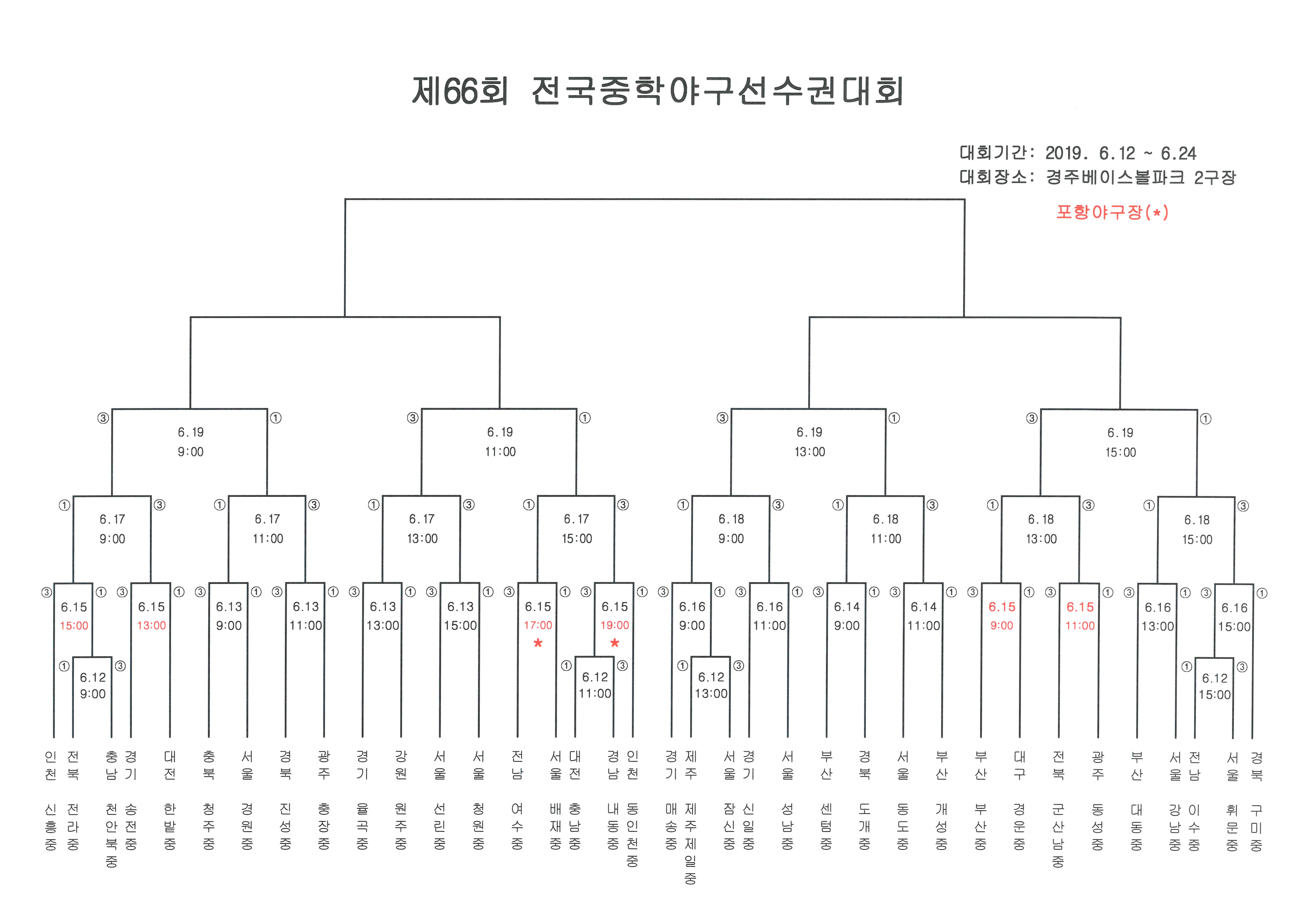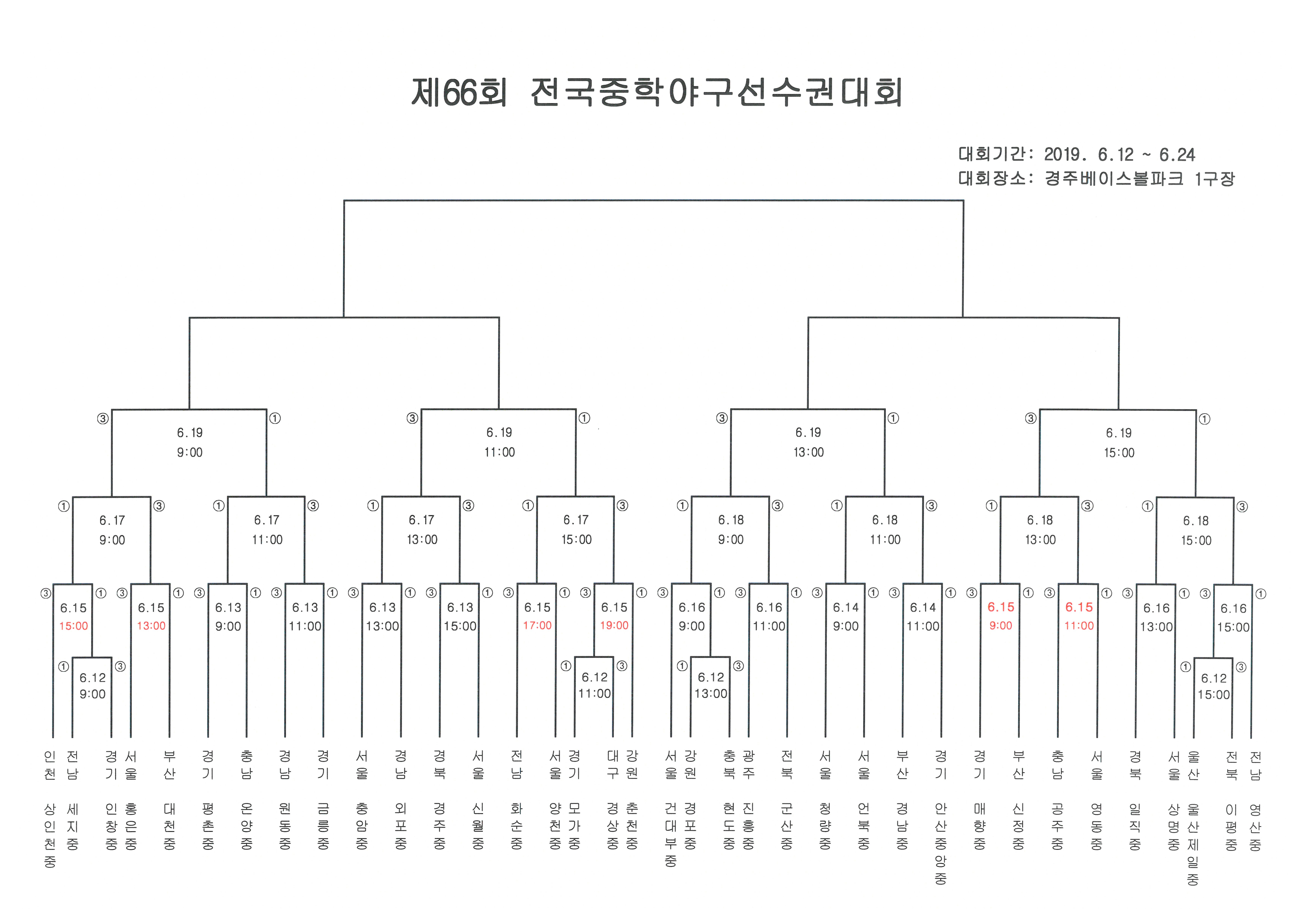 6월 14일 중학야구선수권대회 우천순연으로 6월 15일 경기일정 및 시간이 재조정되었습니다. 자세한 사항은 변경된 대진표를 참고해주시기바랍니다.
