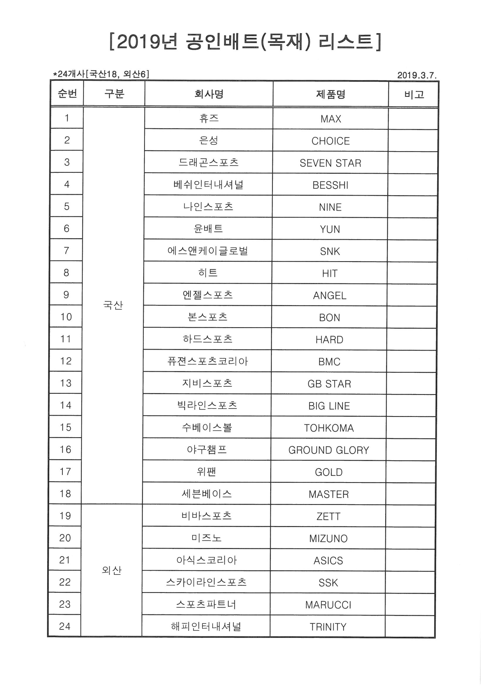 1. 공통(국산/외산): 당해연도 공인배트리스트에 포함된 배트만 사용 가능