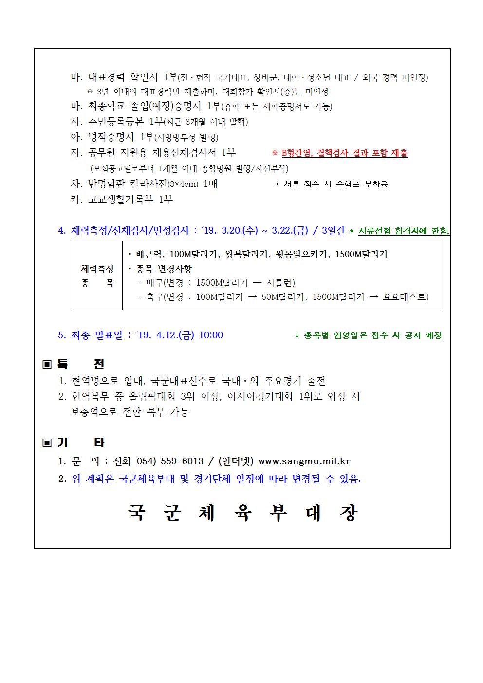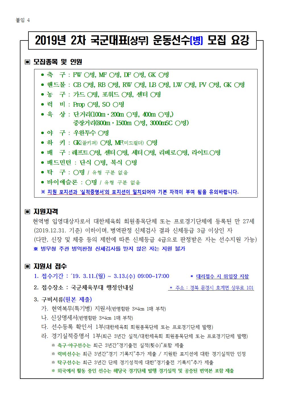 2019년 2차 국군대표(상무) 운동선수(병) 모집 요강