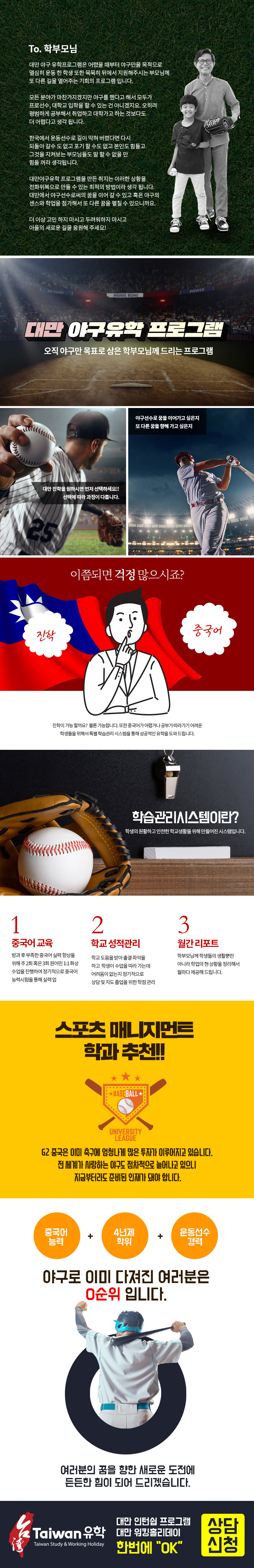 대만 야구 유학 프로그램은 한국에서 오직 야구만 준비했던 학생들에게 국내에서의 국한되지 않고 해외로 나아갈 수 있는 새로운 방향을 제시해드릴 수 있는 특별한 프로그램입니다.