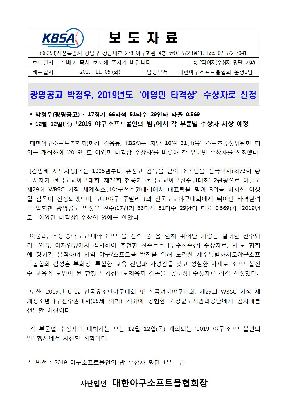 보도자료(광명공고 박정우 이영민 타격상 수상자로 선정)(2019.11.05.).jpg 보도자료(광명공고 박정우 이영민 타격상 수상자로 선정)(2019.11.05.).hwp 2019 야구소프트볼인의 밤 수상 대상자 명단.jpg