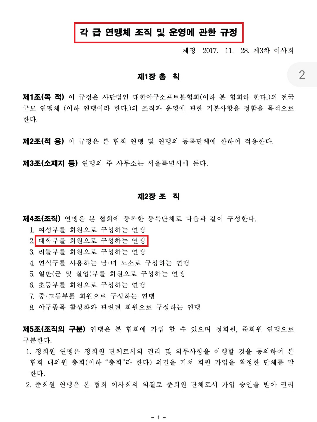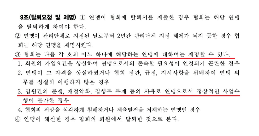 유첨 협회 "각 급 연맹단체 조직 및 운영에 관한 규정 (제정 2017. 11. 28. 제 3차 이사회)" 제 9조 3항에 의거, 아래의 사항들이 한국대학야구연맹(KUBK)에 대한 제명사유가 되는지 확인 부탁드립니다;