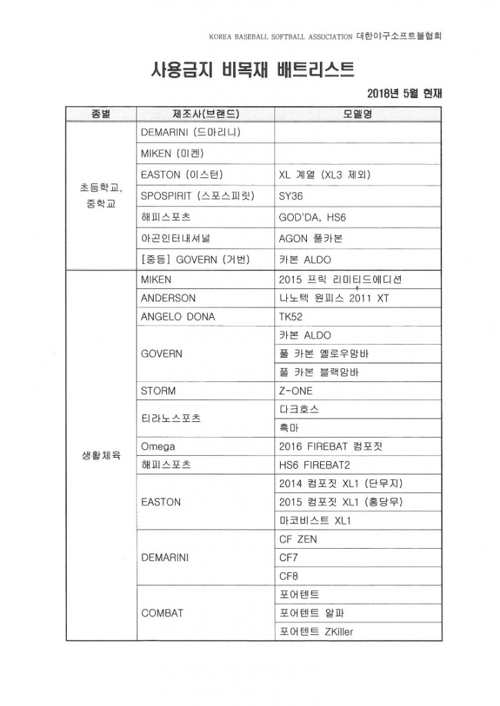 안녕하세요:) 금지배트에 관하여 질문드리고 싶어서 글을 남깁니다. 엔젤도나에서 나오는 tk52배트가 현재 금지배트 목록에 올라와 있는데 카본 소재 배트와 알로이 소재 배트 두 경우 모두 금지인지 알고 싶어서 문의드립니다