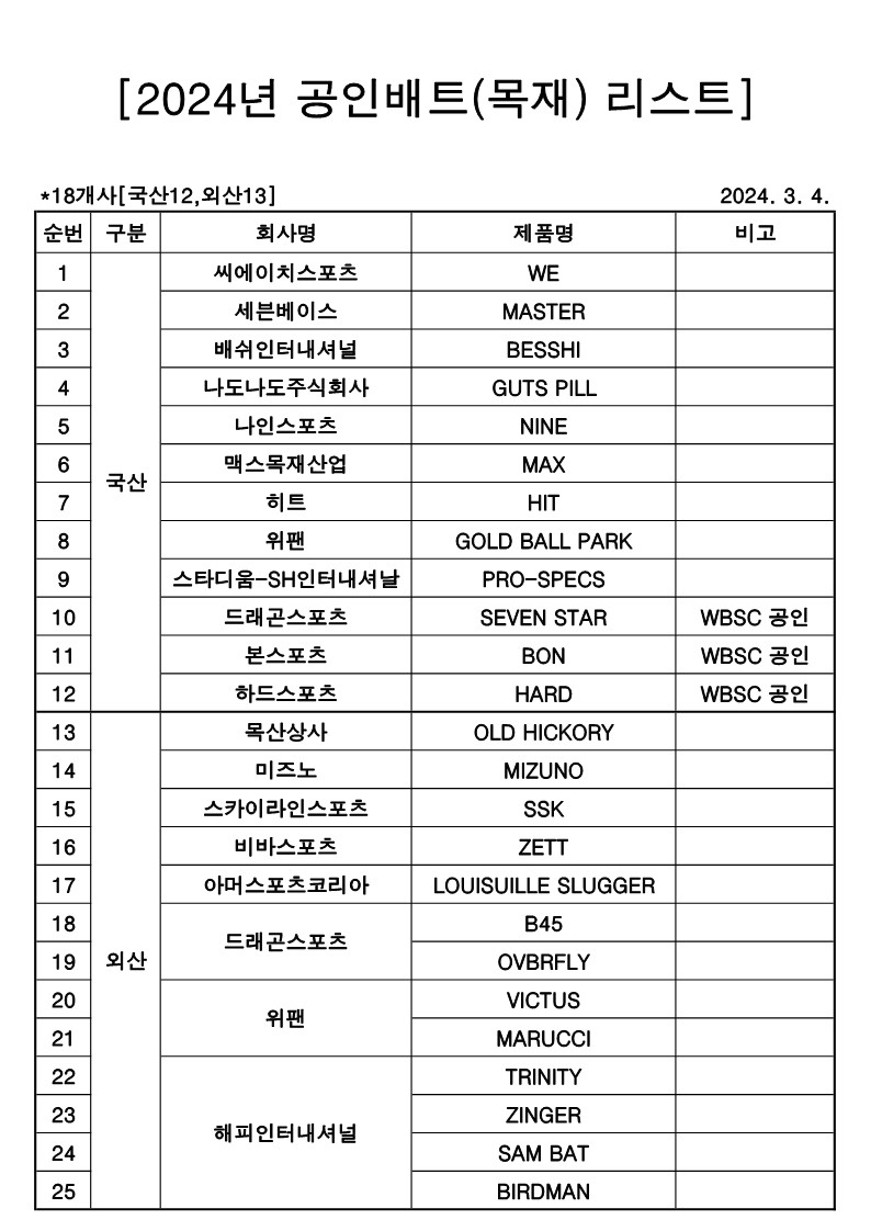 당해연도 공인배트리스트에 포함된 배트만 사용 가능
