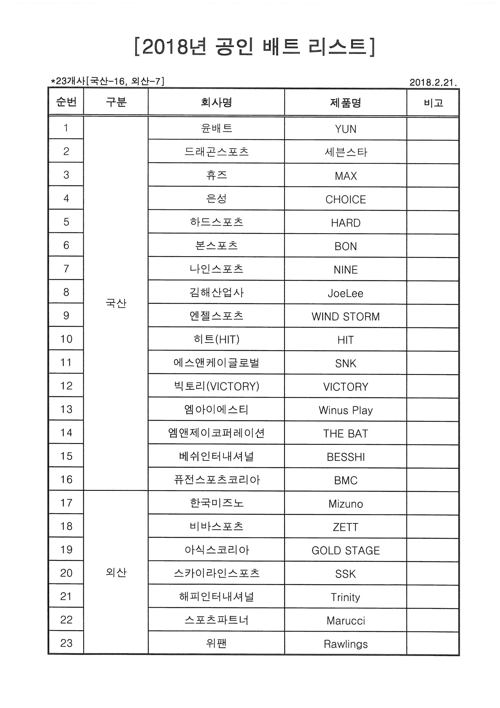 2018년 공인 배트(목재) 리스트 (2018.2.21.)