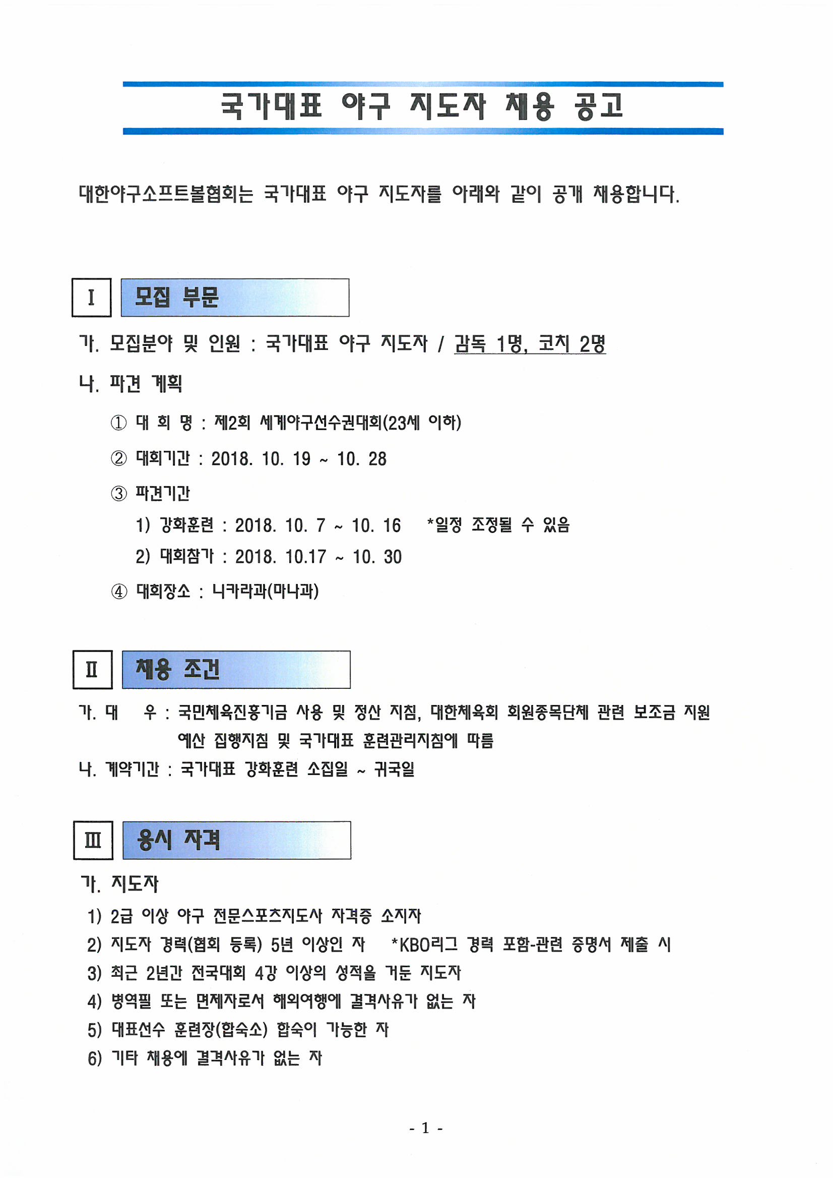 국가대표 야구 지도자 채용 공고