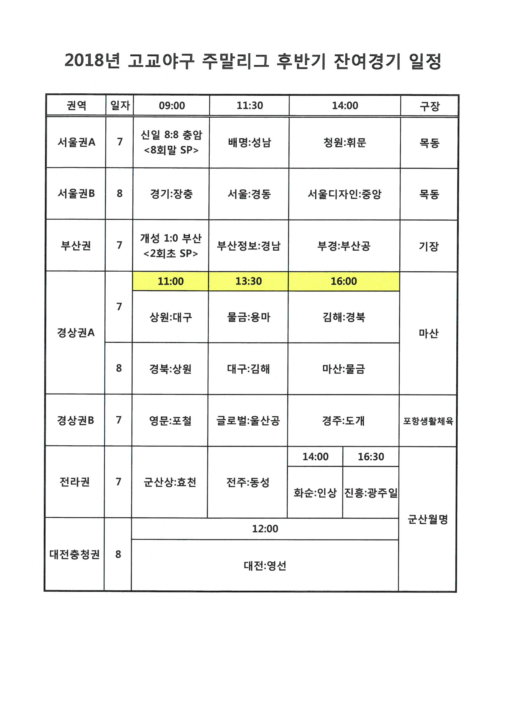 2018 고교 주말리그 후반기 잔여경기 일정안내