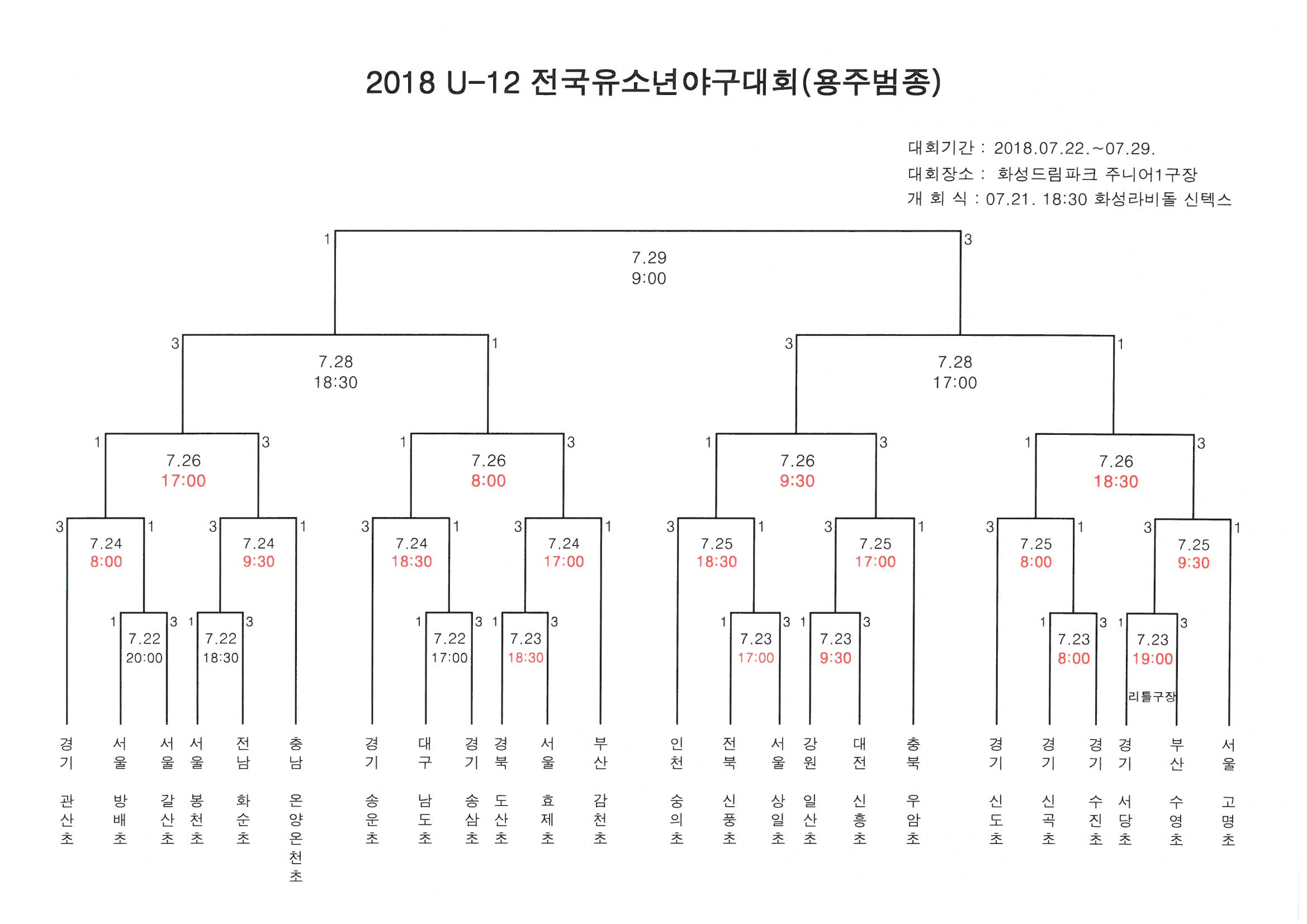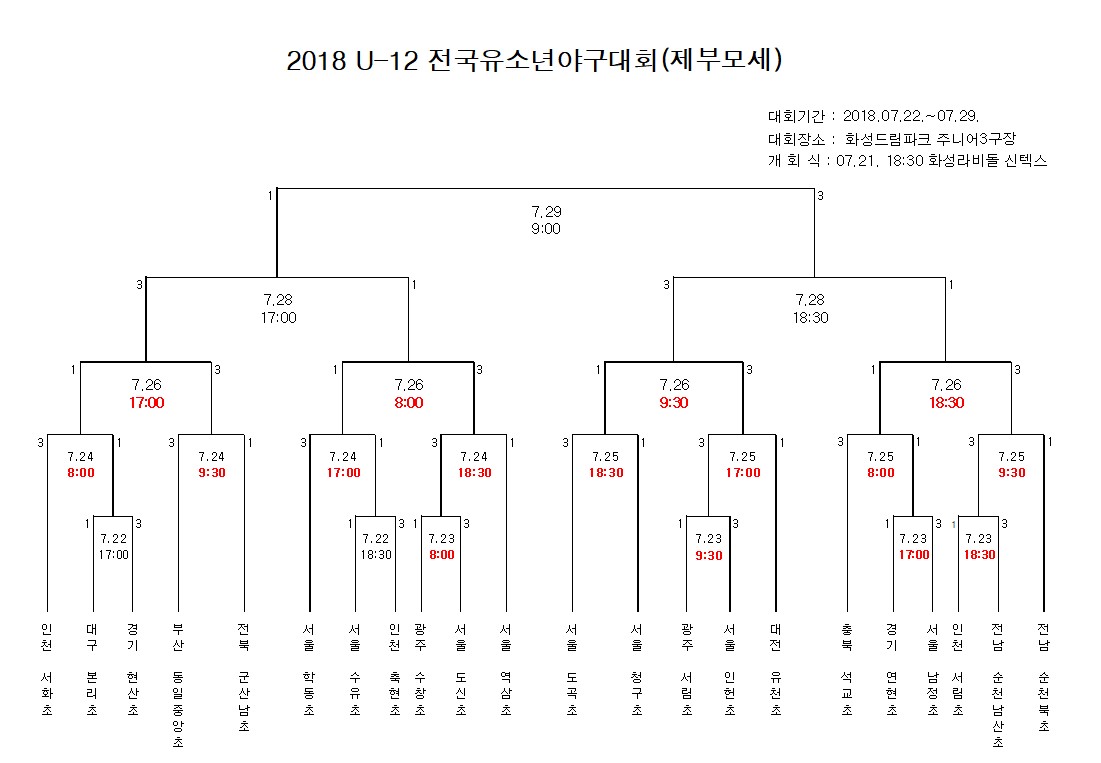 * 2018 U-12 전국유소년야구대회가 혹서기 폭염으로 인하여 경기시간이 재조정되었습니다.