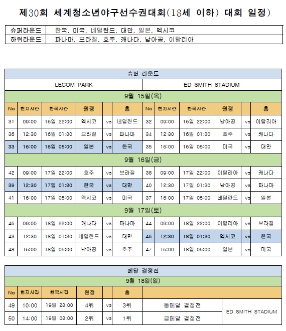 제30회 세계청소년야구선수권대회(18세 이하) 슈퍼라운드 일정 안내