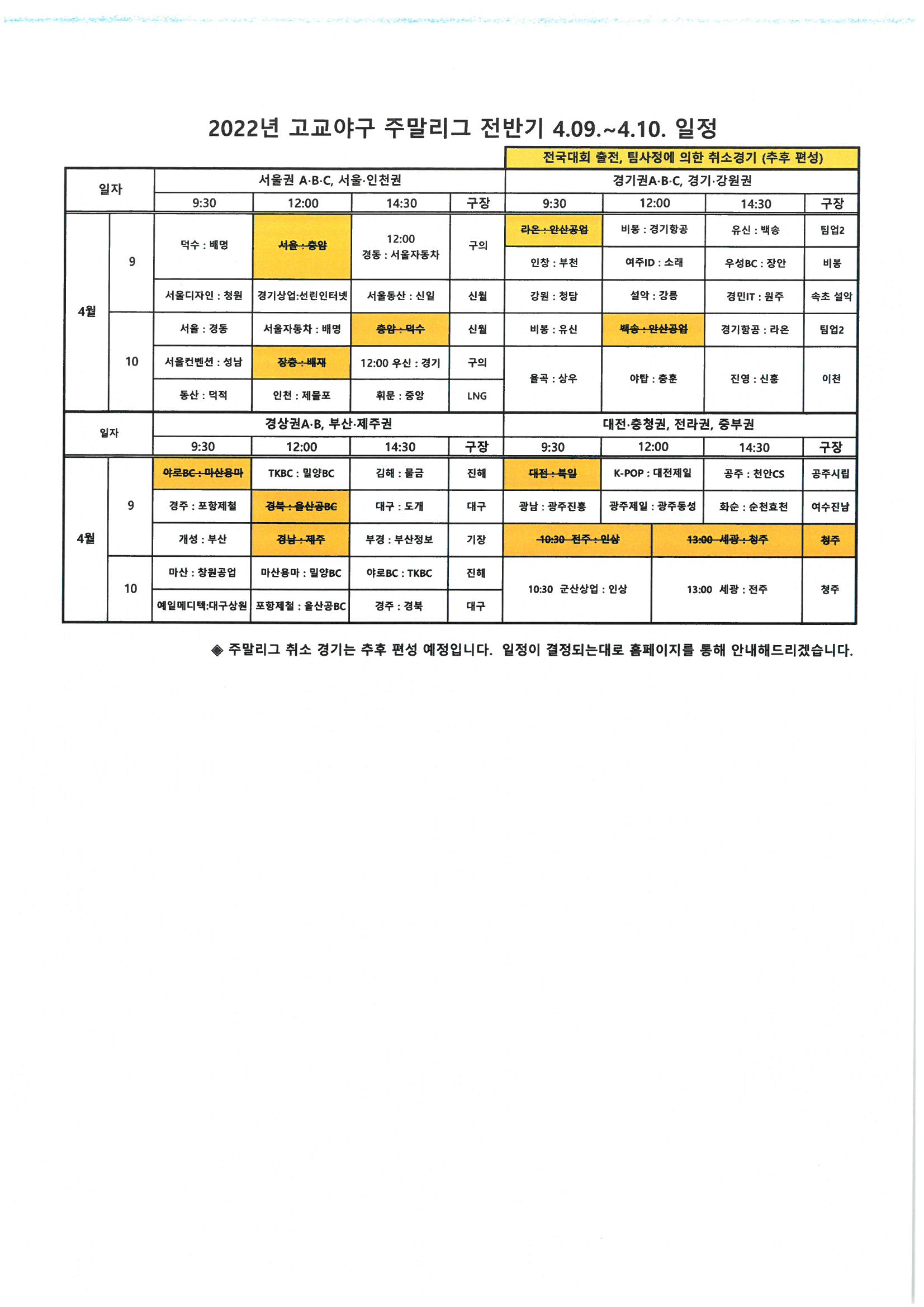 2022 고교야구 주말리그 전반기 (04.09.~10.) 취소경기 반영 경기일정 (04.08.)