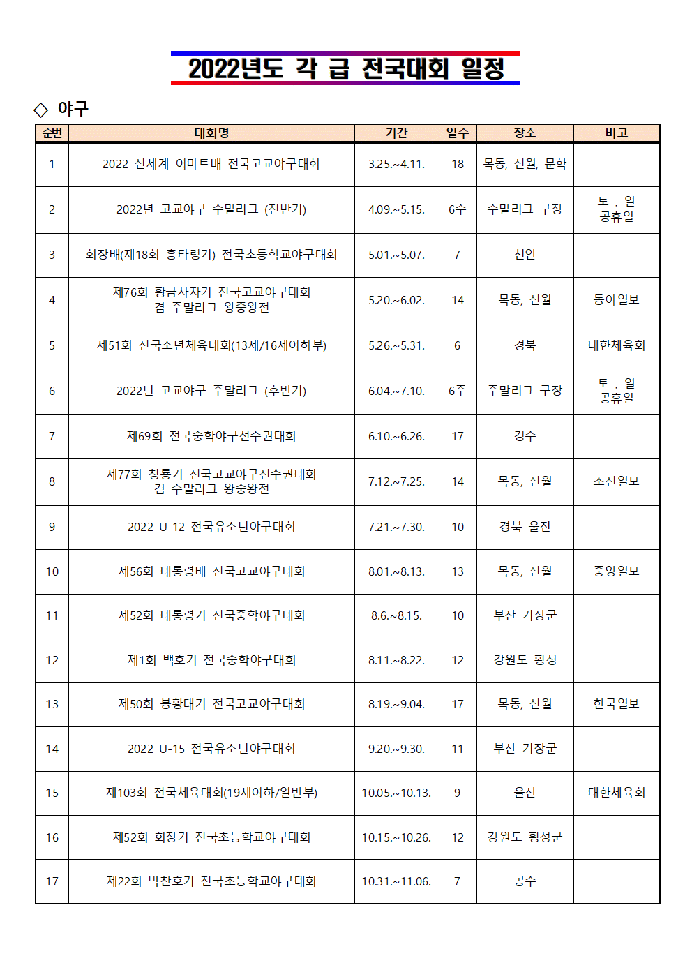 2022년도 각 급 전국대회 일정 안내