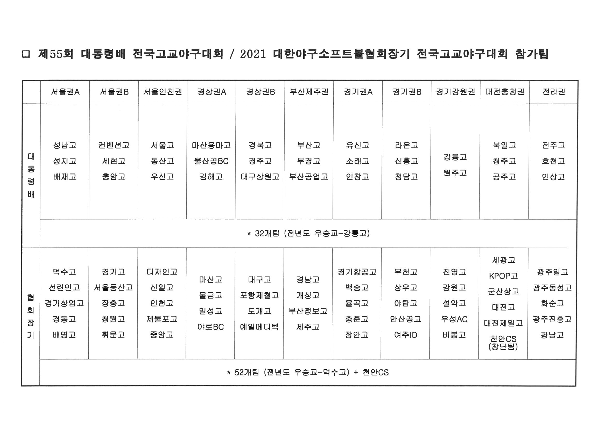 제55회 대통령배 / 2021 대한야구소프트볼협회장기 전국고교야구대회 참가팀 안내
