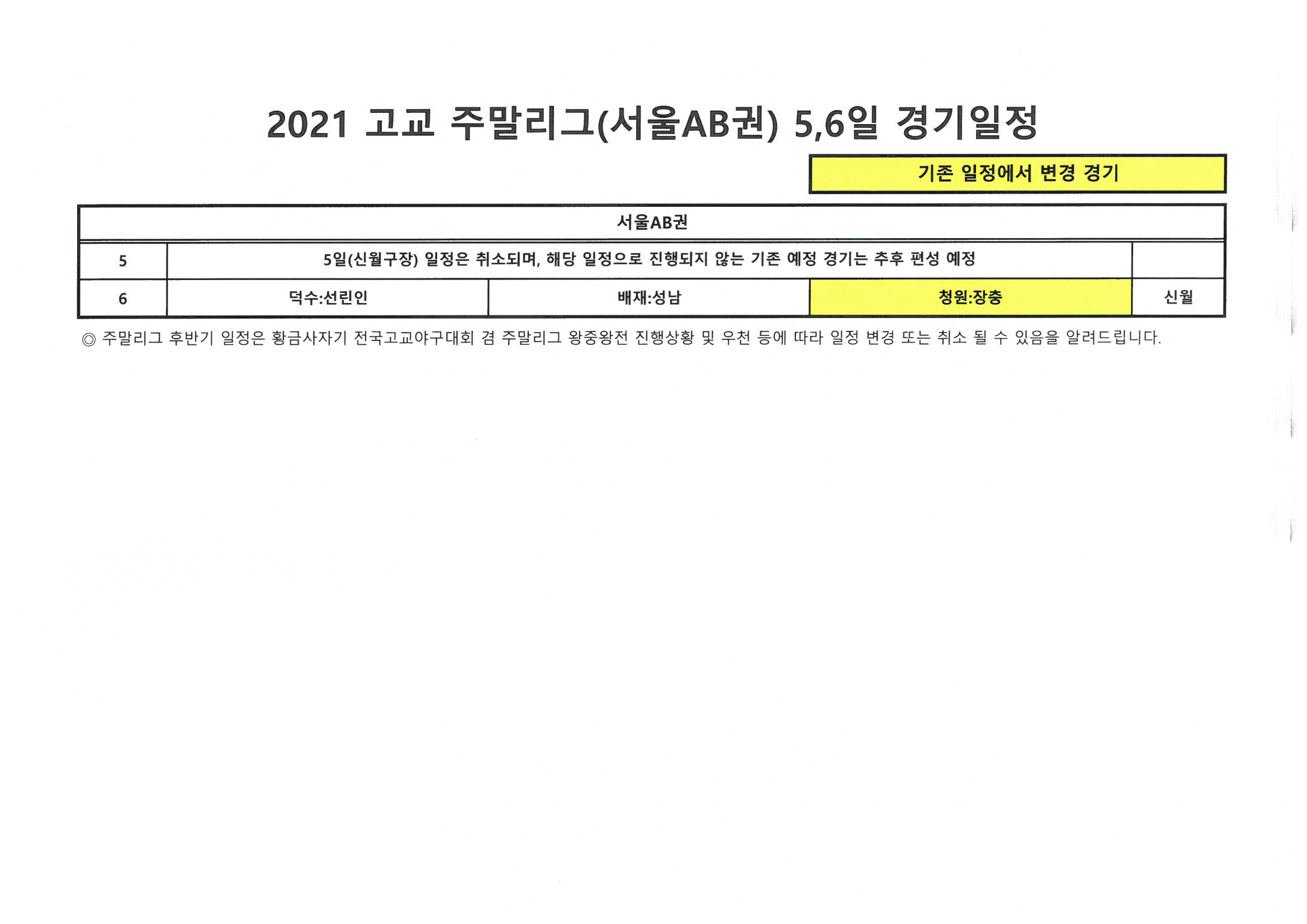 2021 고교야구 주말리그 후반기 경기일정을 위와 같이 재편성하고