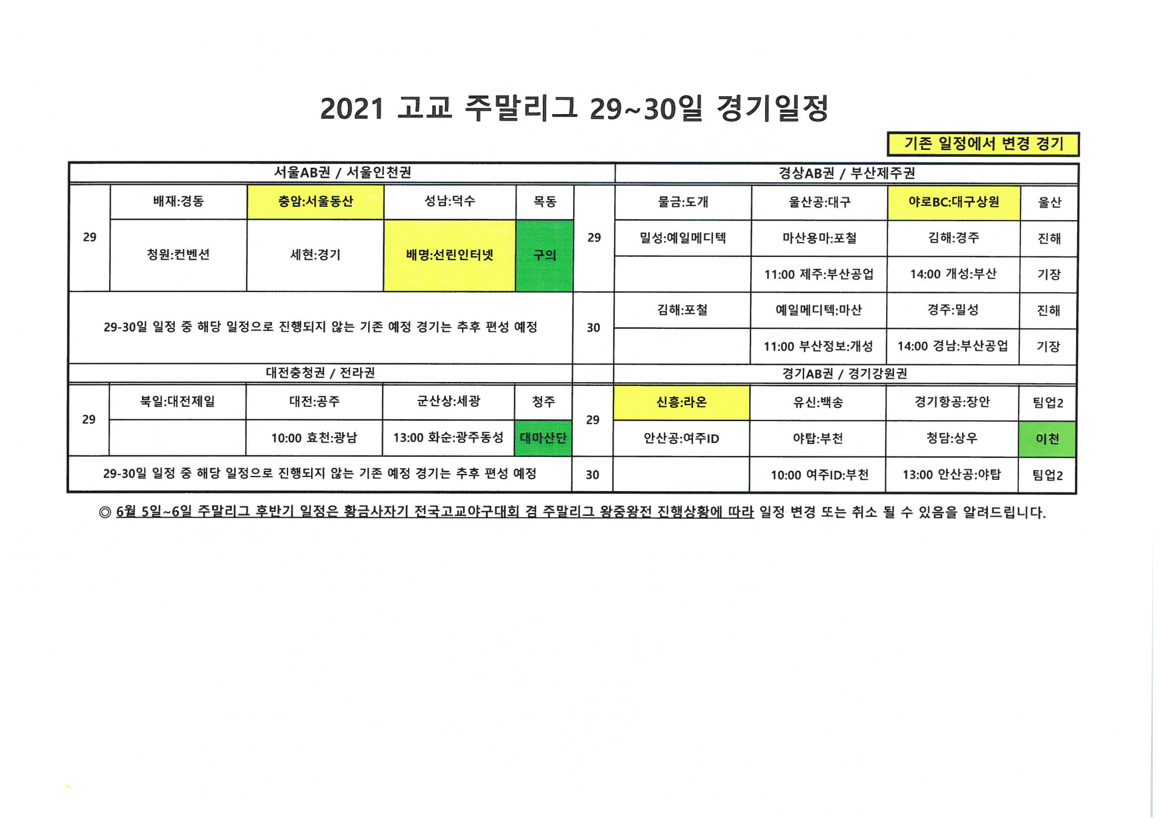 2021 고교야구 주말리그 후반기 경기일정을 위와 같이 재편성하고
