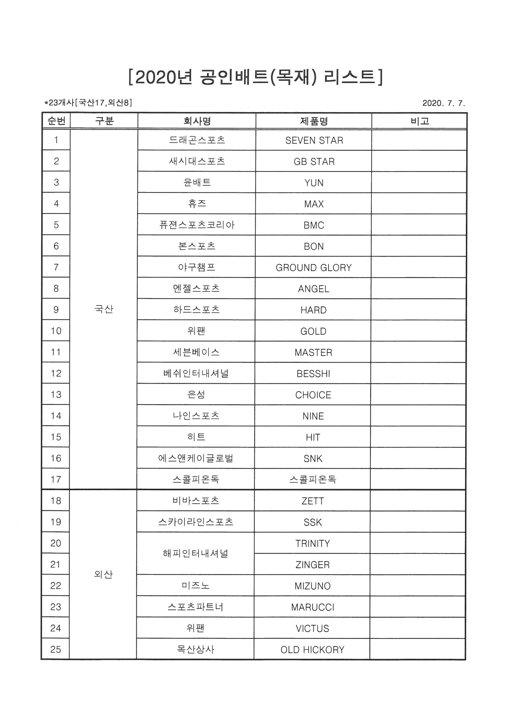 1. 공통(국산/외산): 당해연도 공인배트리스트에 포함된 배트만 사용 가능