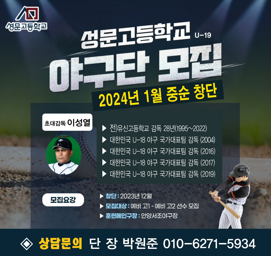 안양 성문고등학교 야구단(u-19) 야구부 선수 모집