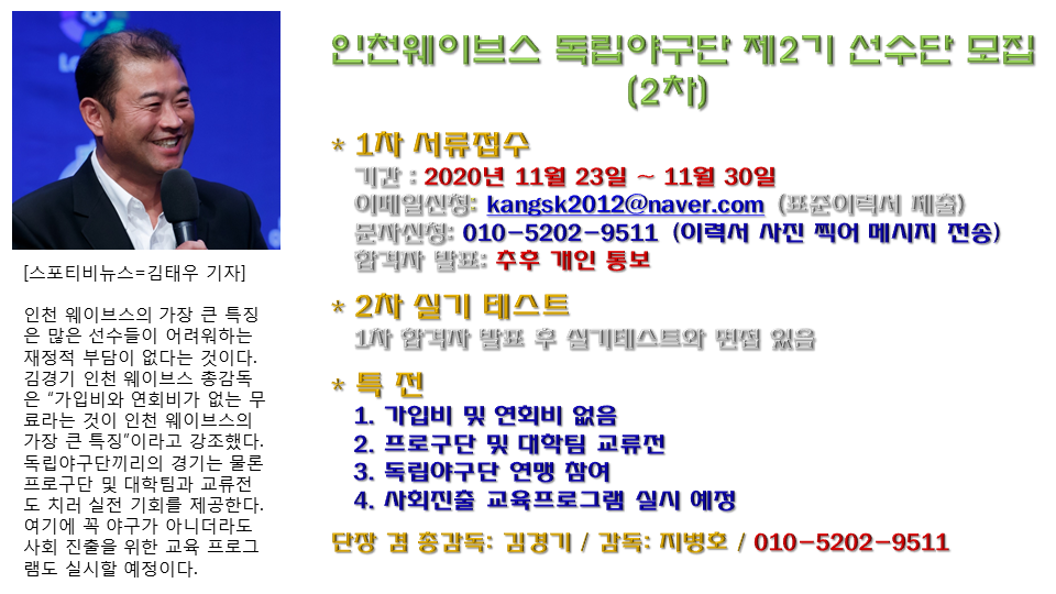 인천 웨이브스 독립야구단 제2기 선수단 모집(2차)