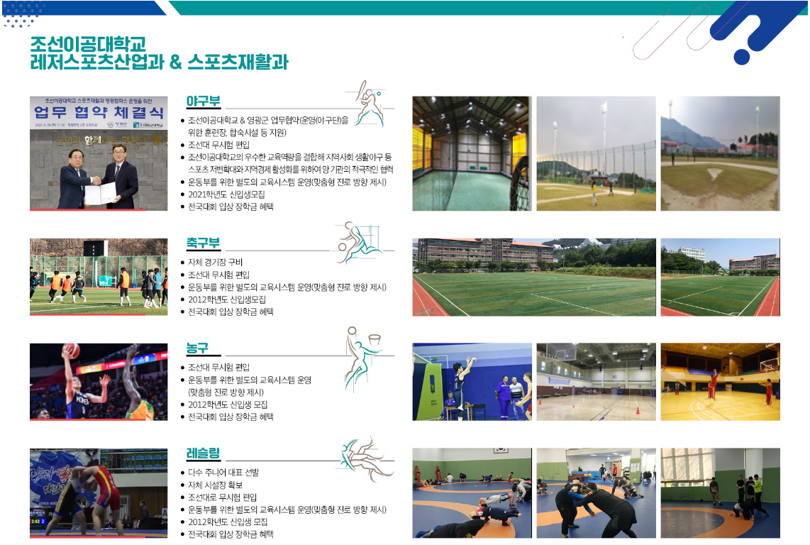 - 학생선수는 전문학사(2년)과정 졸업 후 프로구단 선수 선발과 4년제 체육관련 대학으로 편입가능(조선대학교 체육학과 무시험 편입 가능)