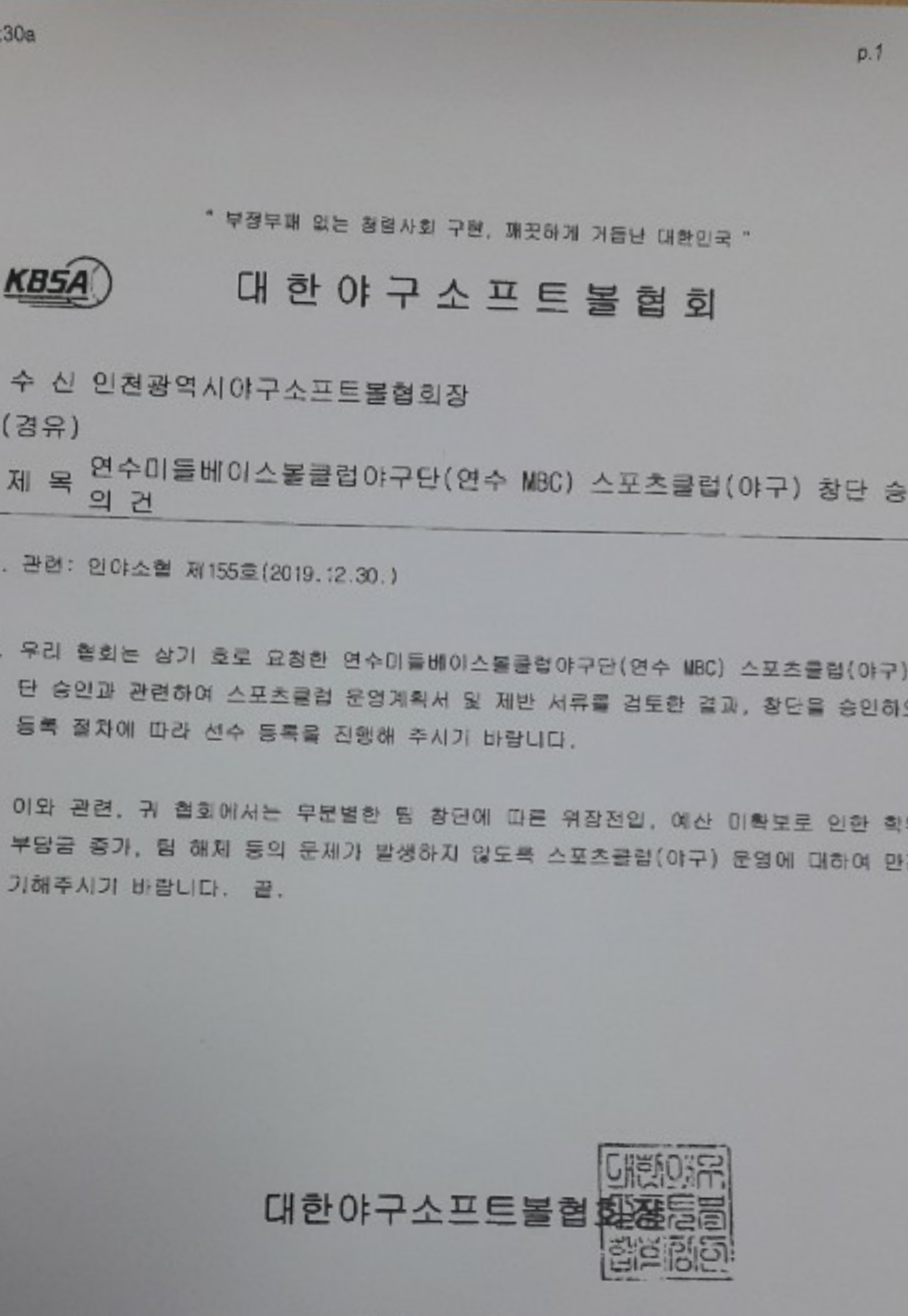 전체 대회 참가를 대한야구소프트볼 협회로 부터 정식 승인받은