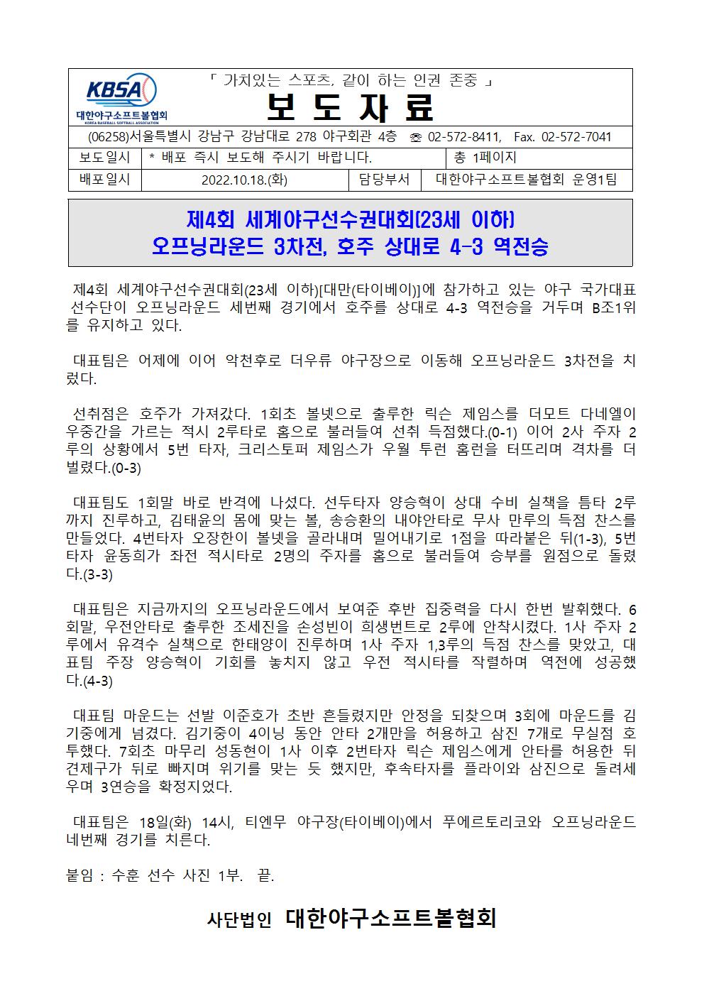 보도자료(제4회 세계야구선수권(23세 이하) 오프닝라운드 3차전, 호주 상대로 4-3 역전승)001.jpg