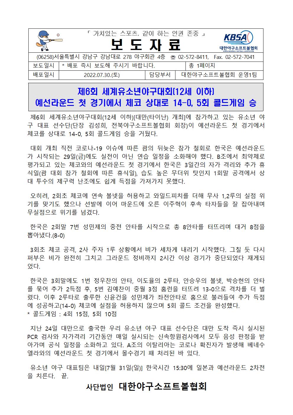 보도자료(제6회 세계유소년야구대회 예선라운드 첫 경기 체코 상대 14-0, 5회콜드 승)001.jpg