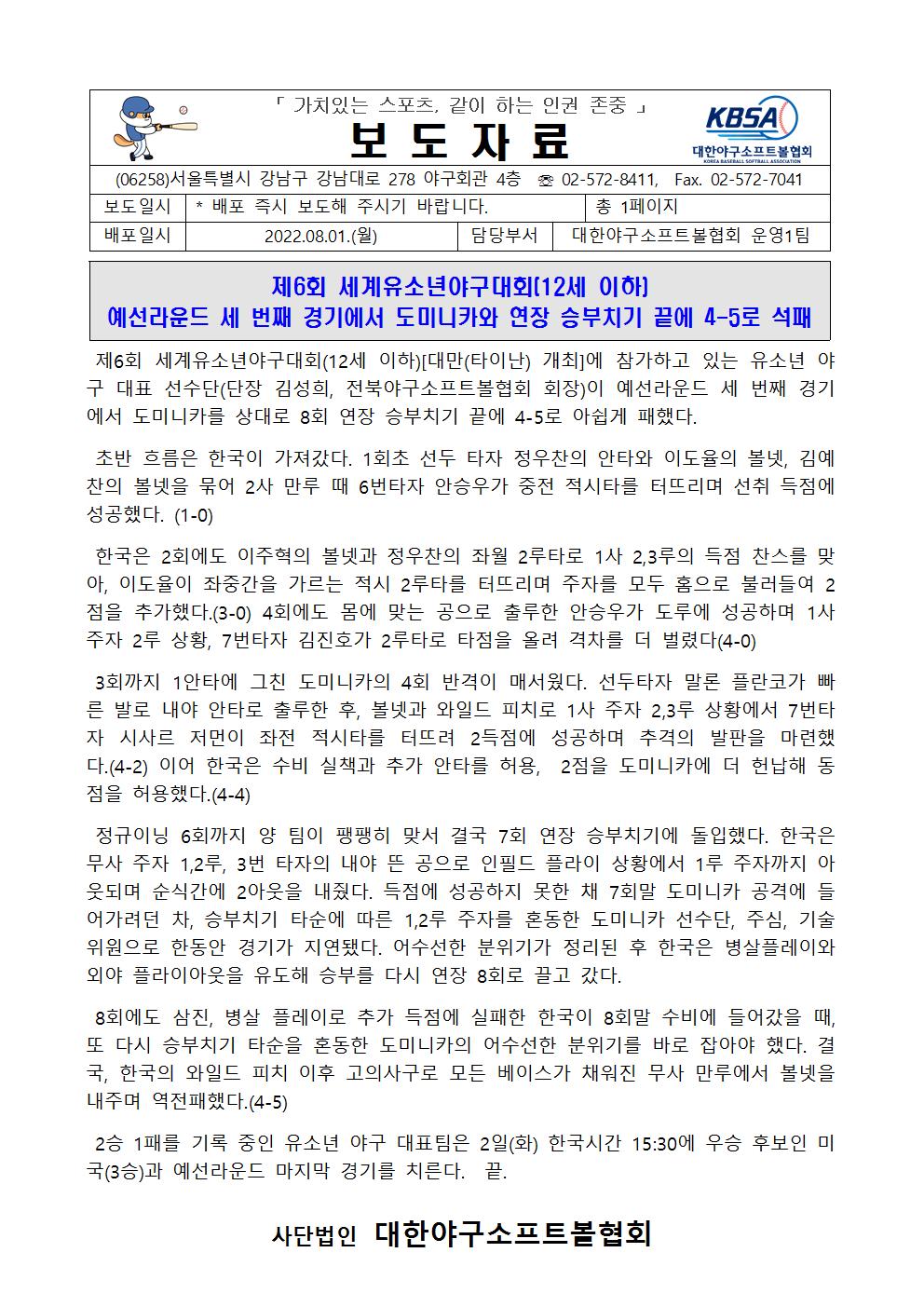 보도자료(제6회 세계유소년야구대회 예선라운드 세번째 경기에서 도미니카와 연장 승부치기 끝에 4-5로 석패)001.jpg