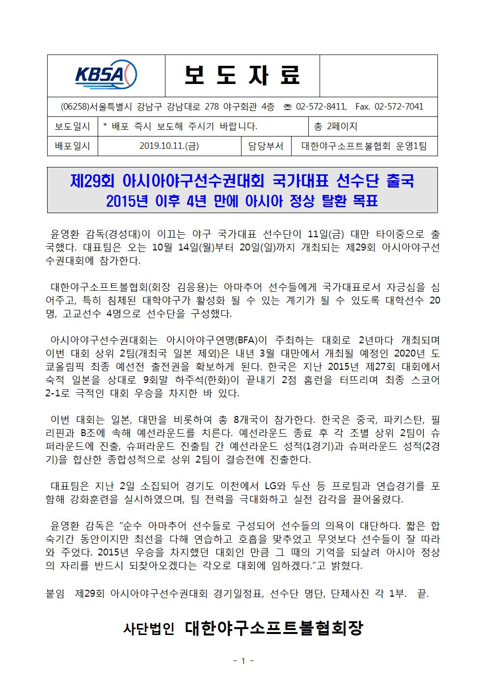 보도자료(제29회_아시아야구선수권대회_국가대표_선수단_출국)-20191011.hwp