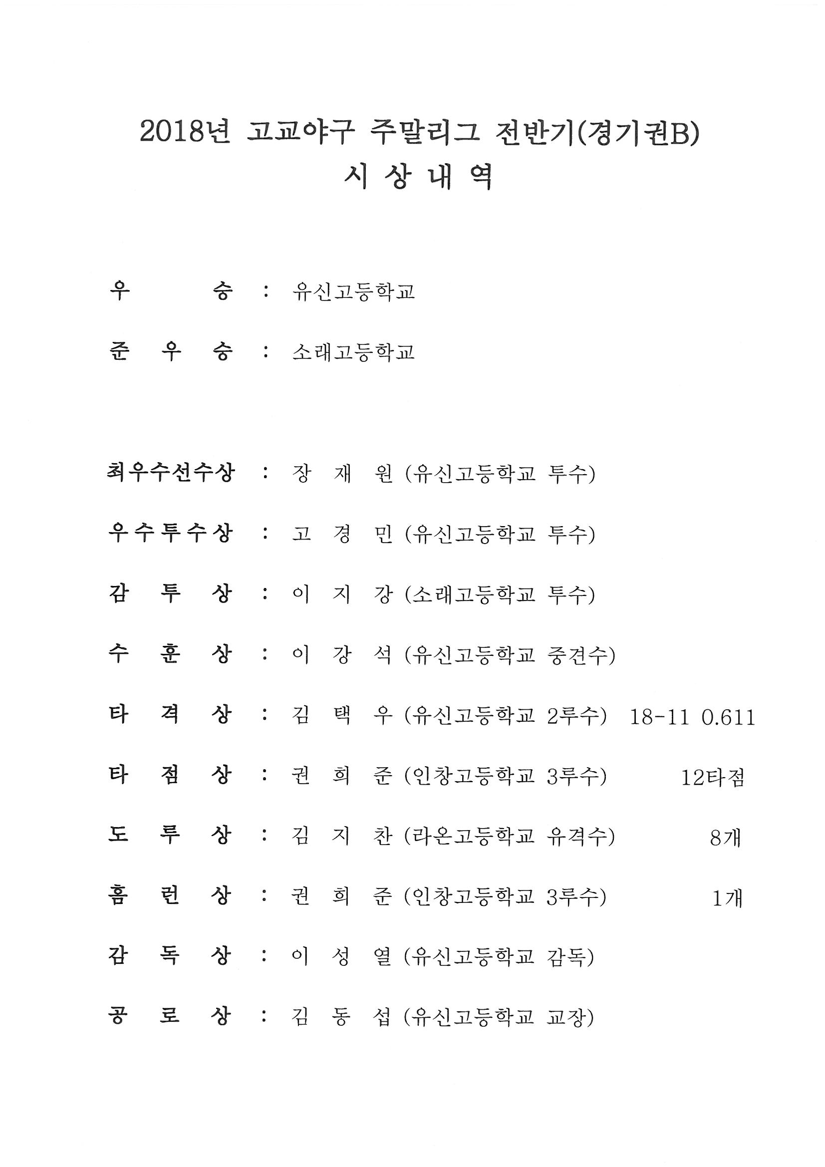 * 별첨 : 고교 주말리그 전적표, 경기권B 시상내역. 1부.