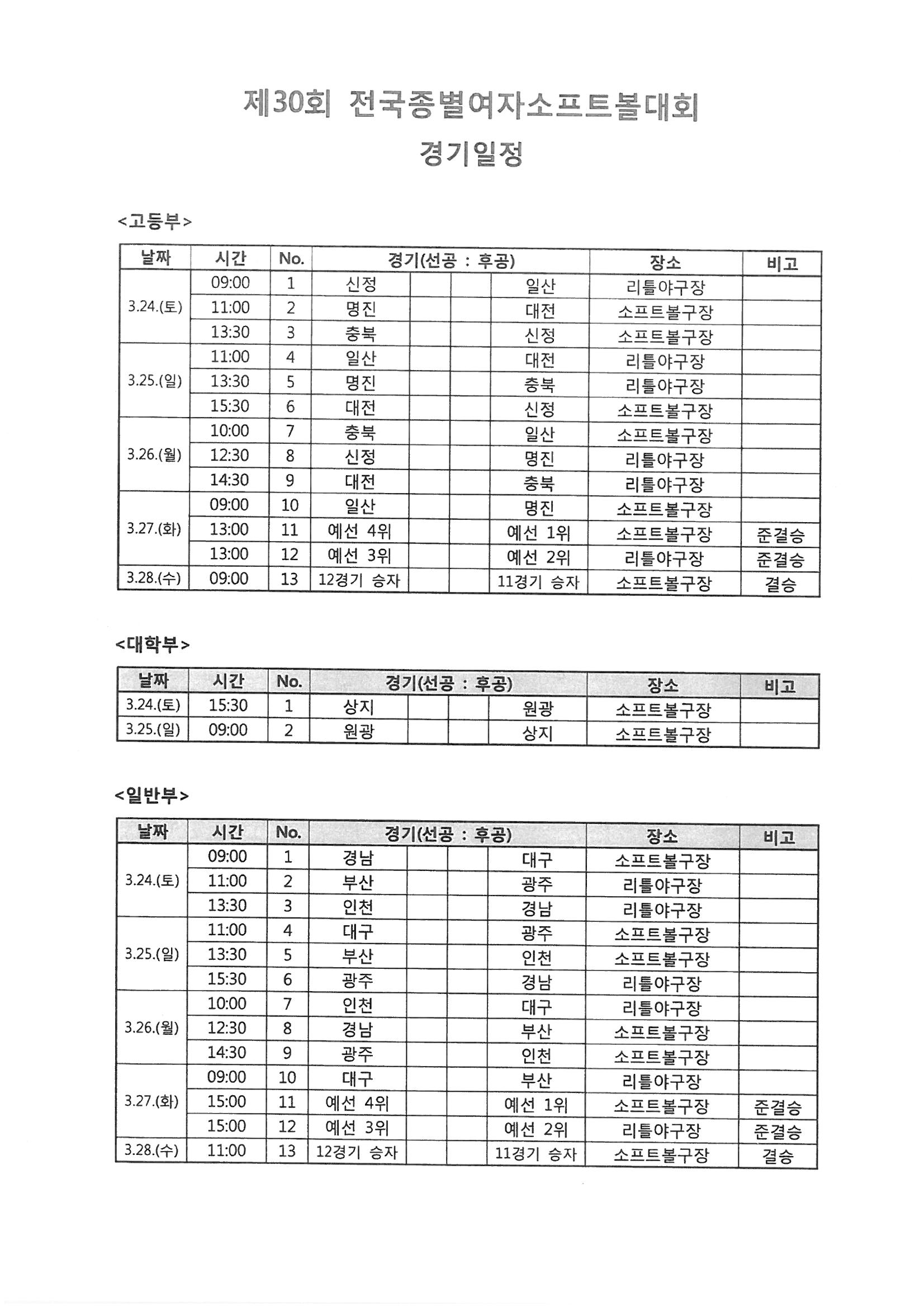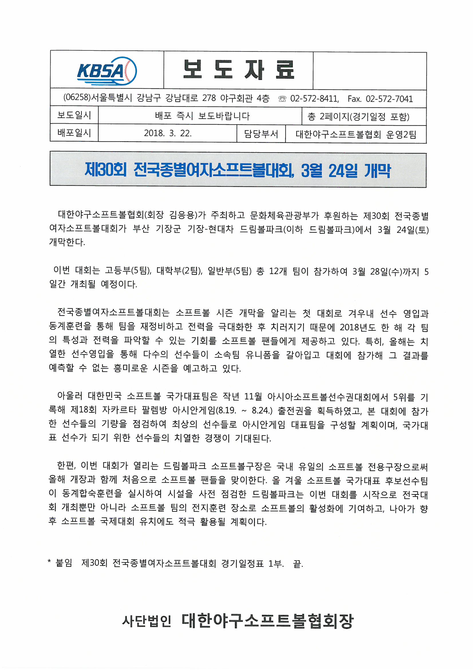 [보도자료] 제30회 전국종별여자소프트볼대회, 3월 24일 개막