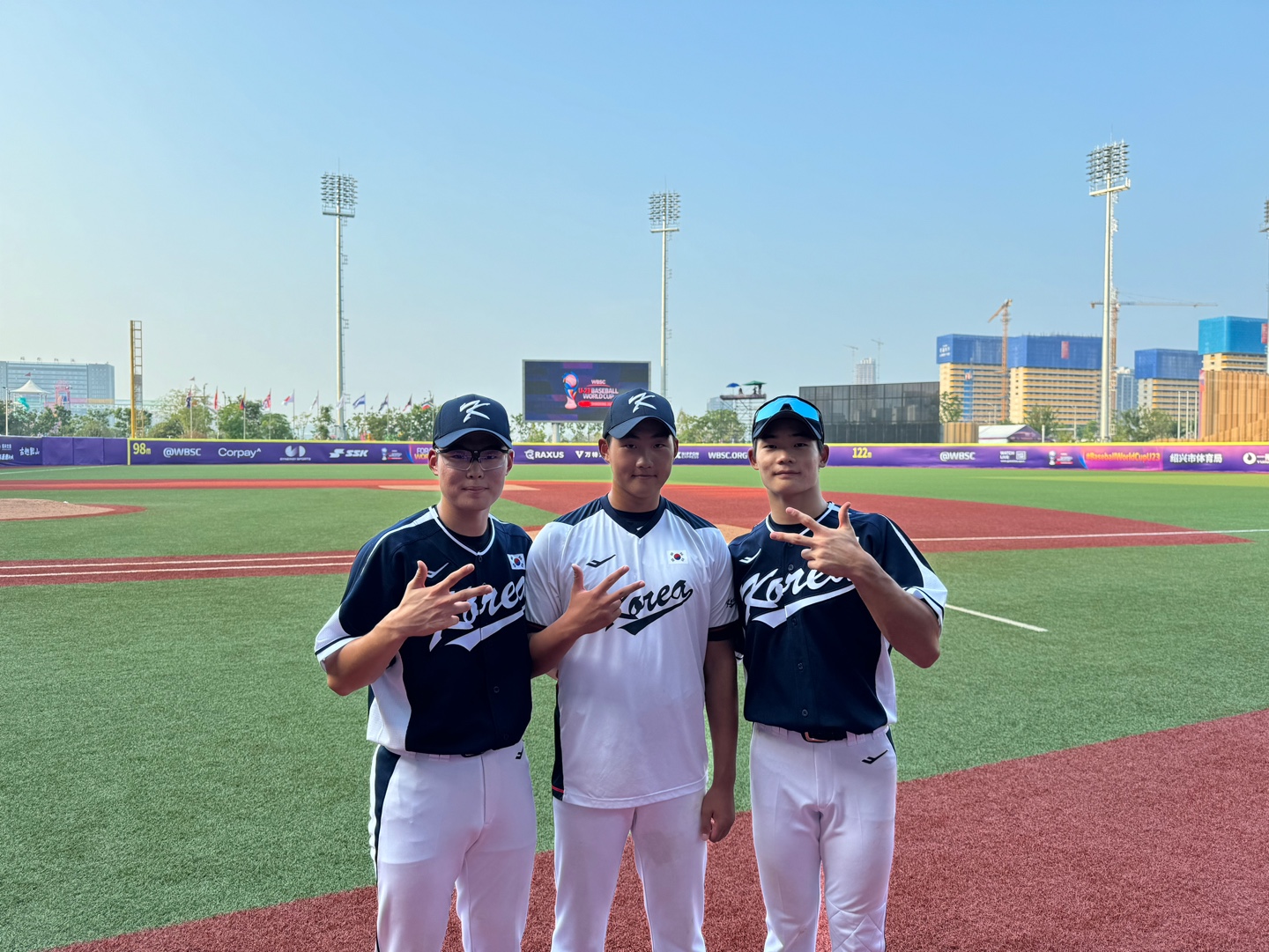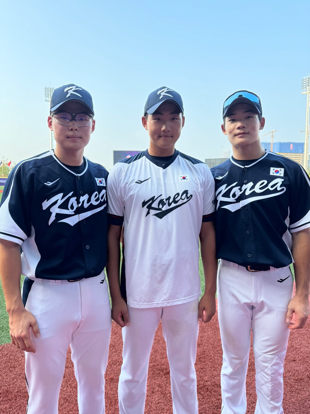 사진설명 대만전을 승리로 이끈 오른쪽부터 송재영(롯데 자이언츠), 김태현(광주제일고 3), 정안석(한화 이글스) 선수의 경기 후 사진_2.jpg