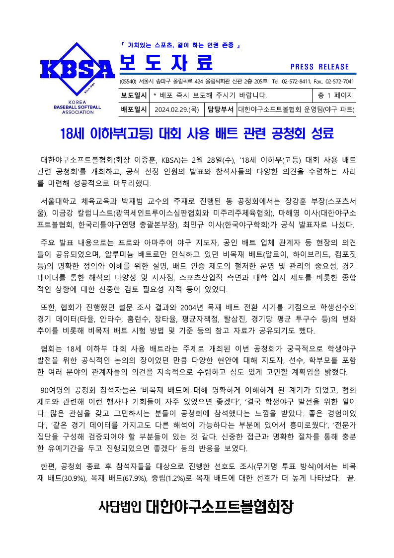보도자료(18세 이하부 대회 사용 배트 관련 공청회 성료)-20240229.hwp